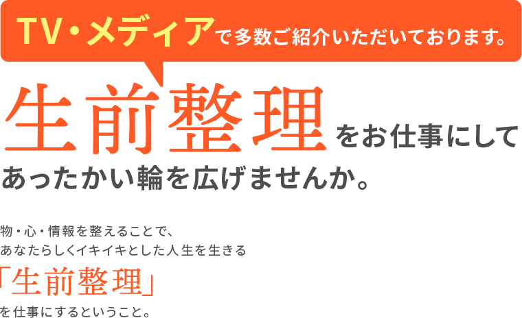 これからのシニア向けの事業を考えている方、地域の高齢者の支援を考えている方など、生前整理でお困りになっている方々のお力になってみませんか?
